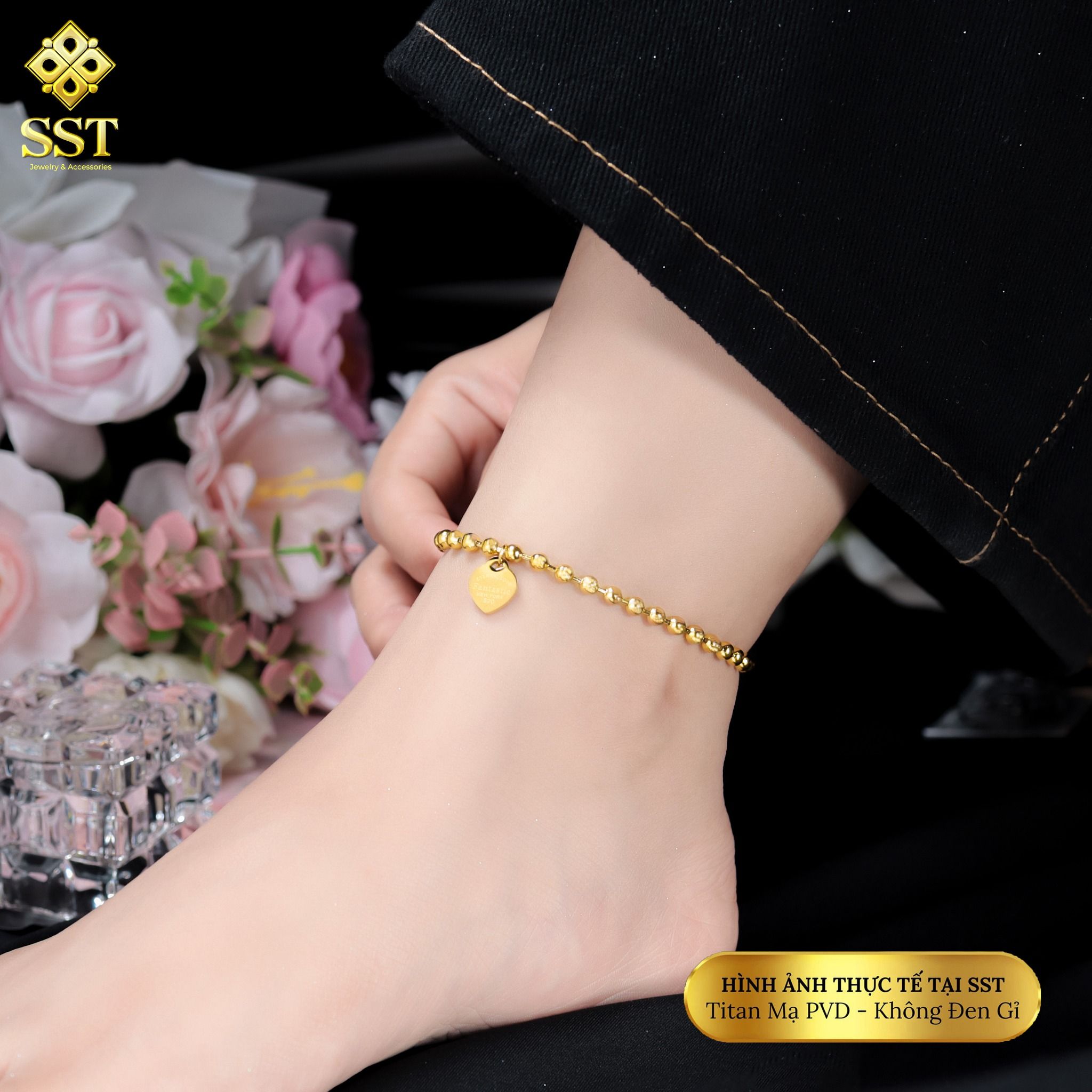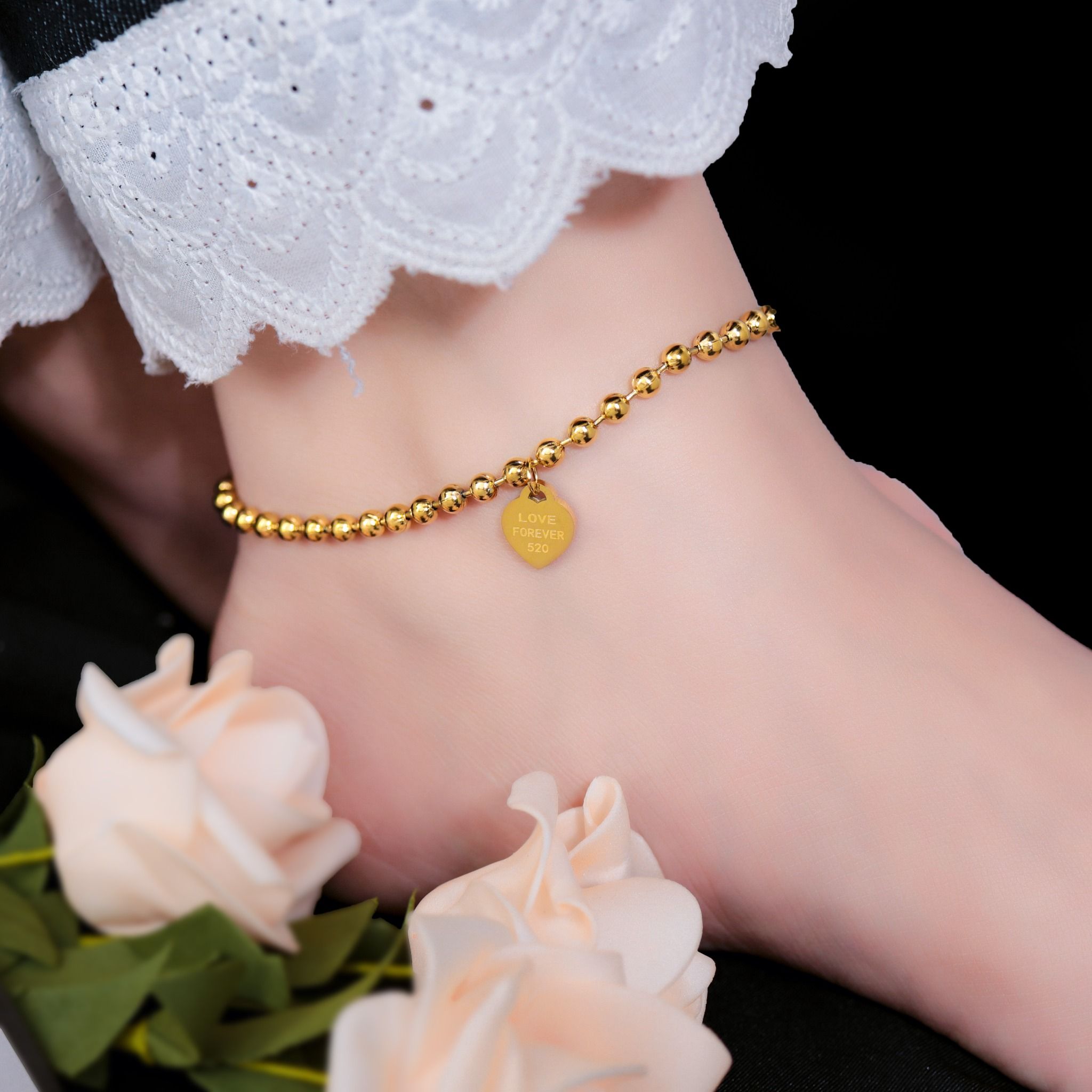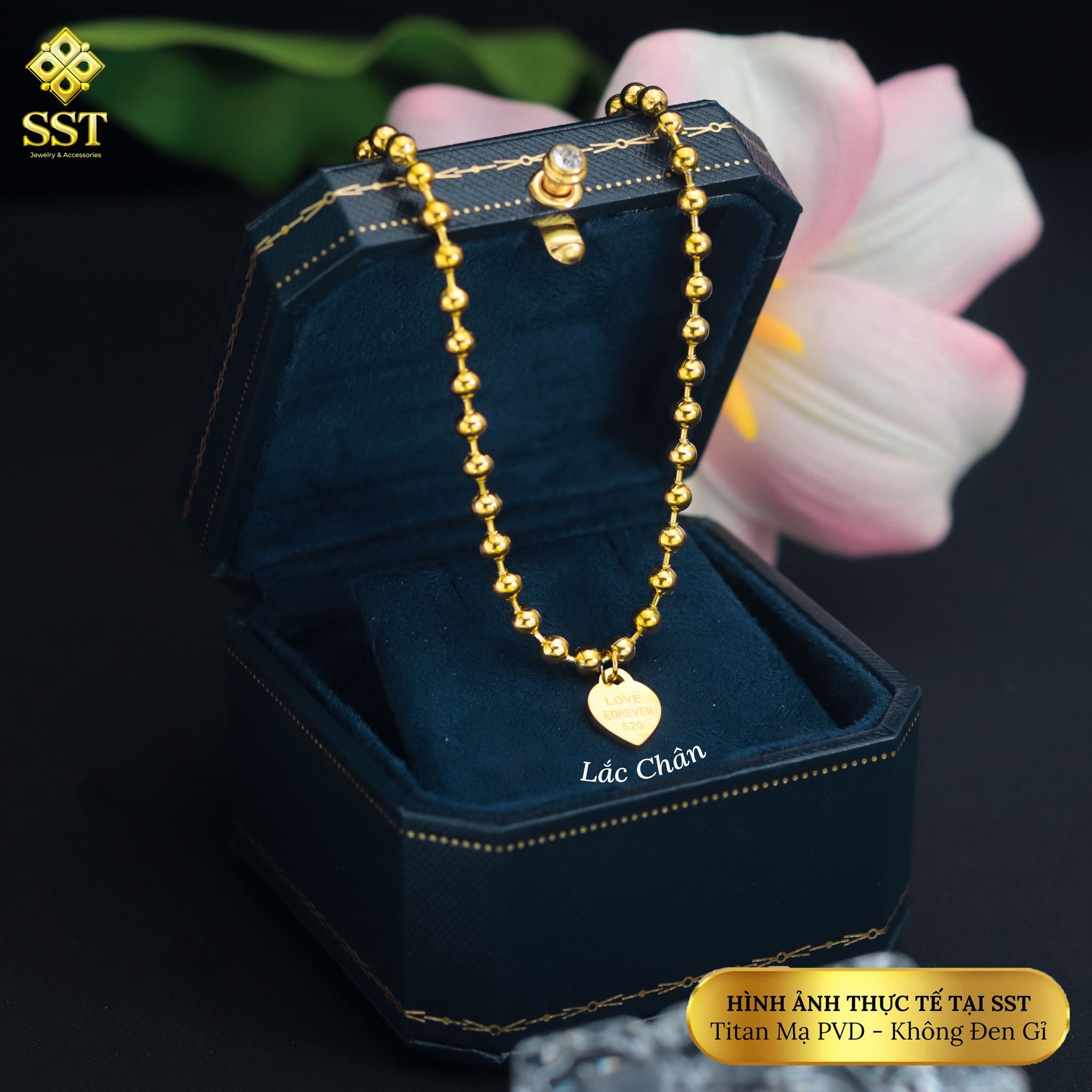 Lắc chân Titan SST Dây bi mặt tim khắc chữ Forever Love thanh lịch Không Đen Gỉ LC07