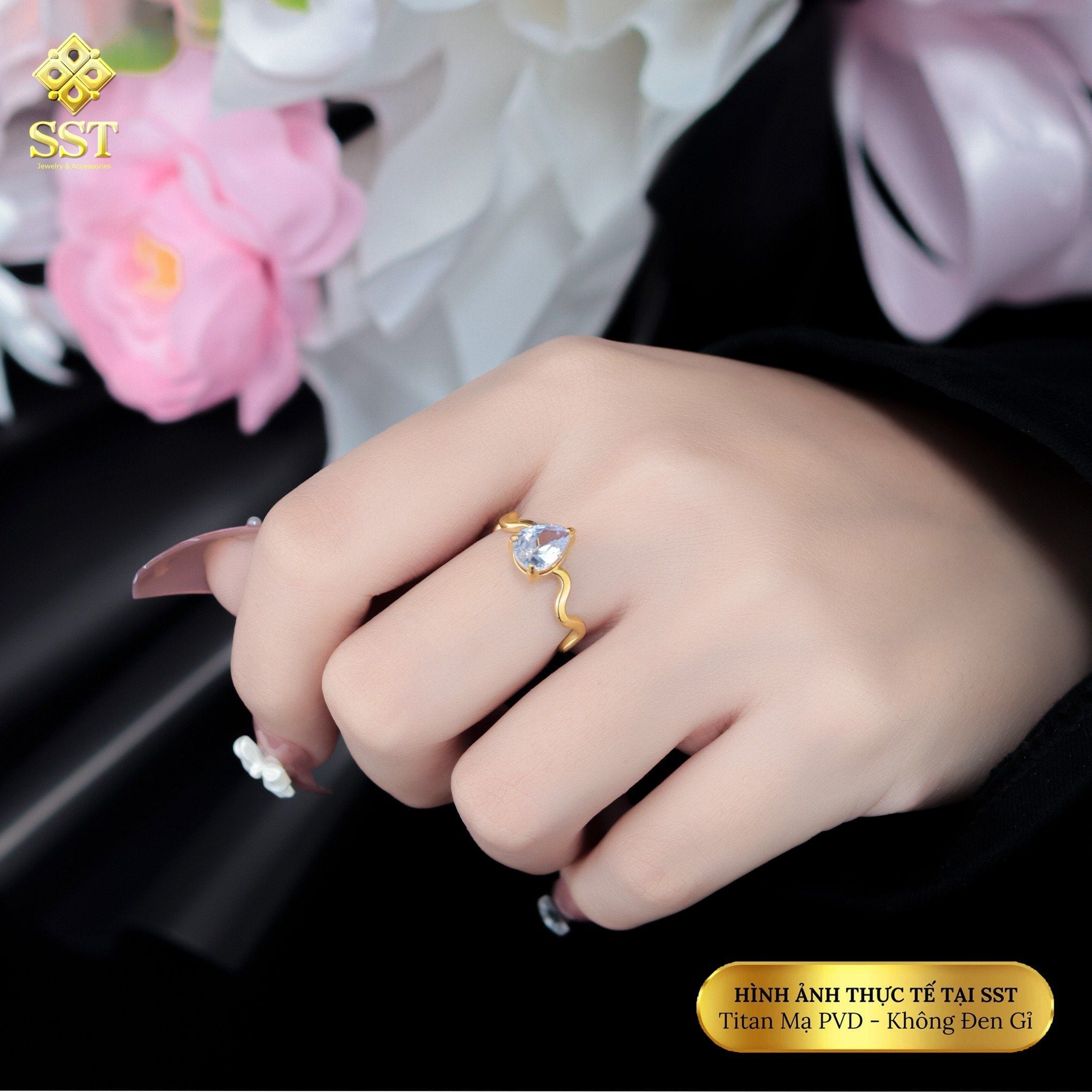 Nhẫn nữ titan SST kiểu gợn sóng Đá giọt nước N287